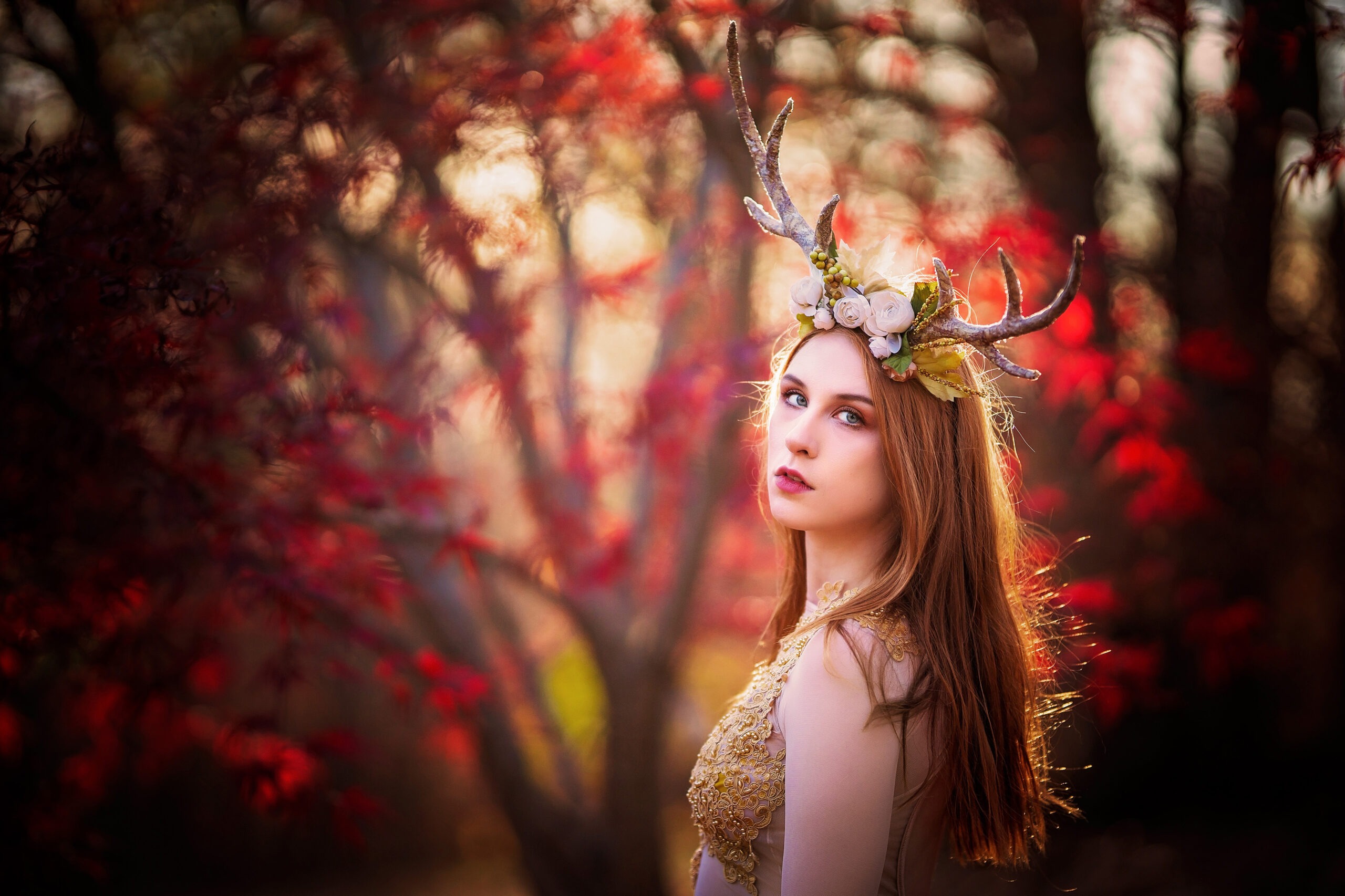 As the woods turn to rust and gold, the forest royalty emerges. Draped in metallic tones and crowned with the ancient symbol of the stag, this adult editorial explores the quiet power of the autumnal transition.